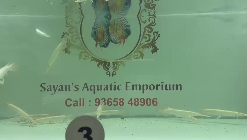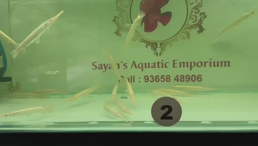 Albino Florida gar are a rare color variation of the Florida gar (Lepisosteus platyrhincus), characterized by a pale, yellowish or white body and distinctive red eyes. They are a predatory species native to the southeastern United States, known for their elongated bodies and needle-like teeth, making them effective hunters of smaller fish. These fish are popular in the aquarium trade due to their unique appearance, but they require large tanks and careful management due to their predatory nature and size.