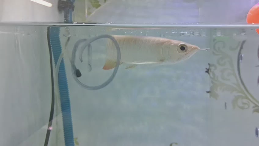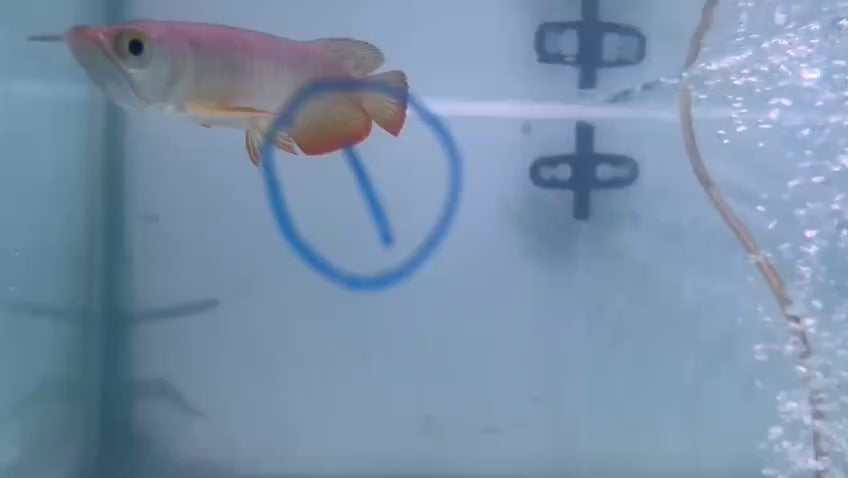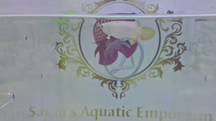 A "Qian Hu RTG Arowana" refers to a Red-Tailed Golden Arowana (RTG) sourced from the Qian Hu fish farm, a well-known breeder. This Arowana is characterized by its brilliant golden scales, particularly the cheeks, and a striking red tail and fins. The RTG is a sought-after breed, recognized by its impressive golden color extending to the start of the tail, with the rest of the tail and fins displaying vibrant red hues.