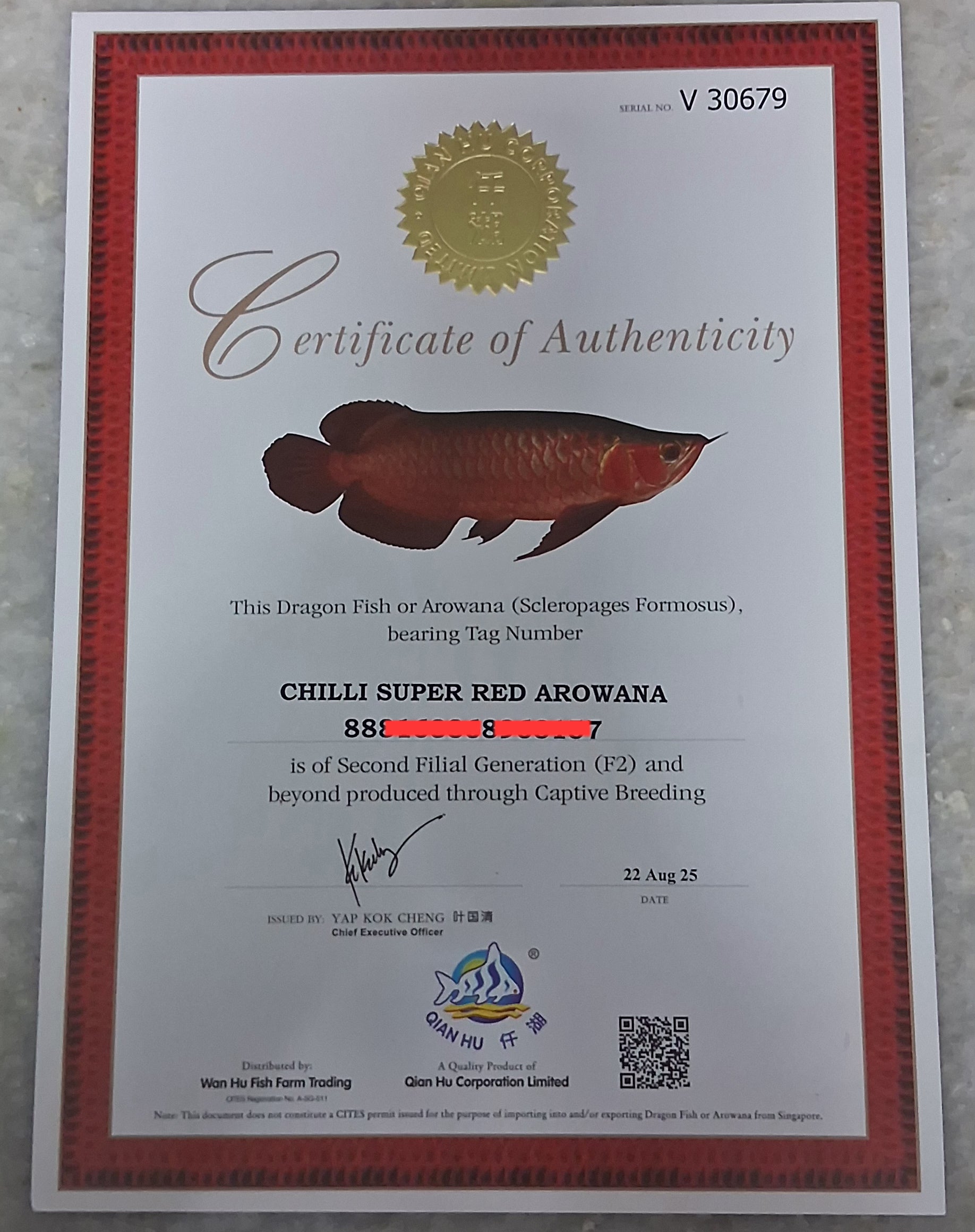 - Certification: Each Chilli Super Red Arowana comes with a Qian Hu Farm certification, verifying its authenticity and quality.